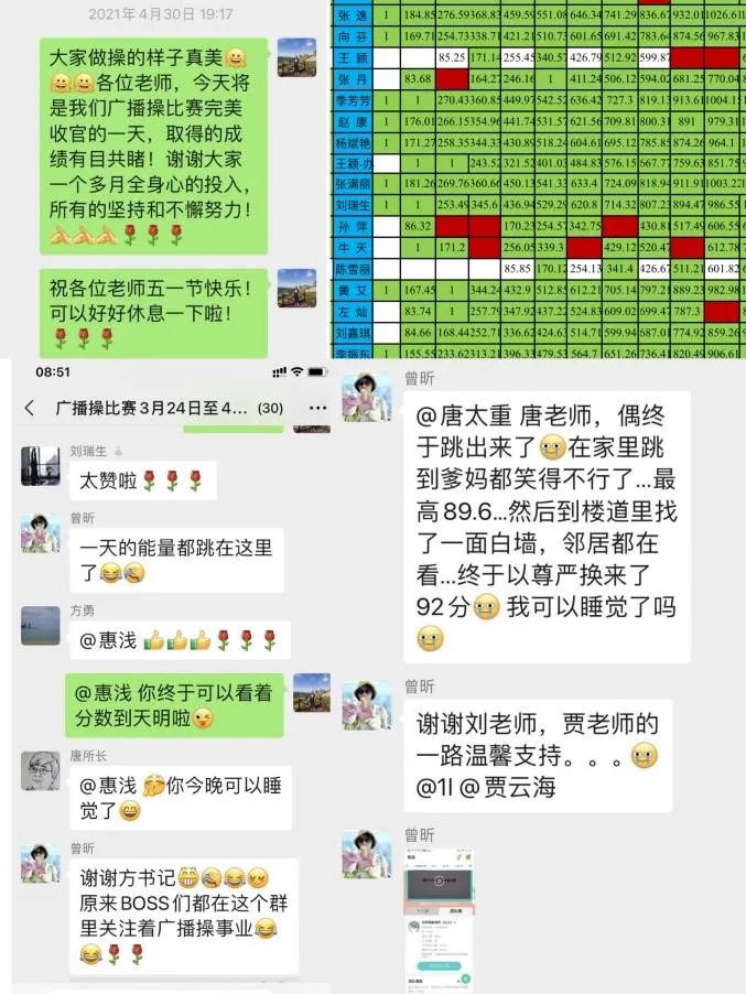 練操之初,不論所領(lǐng)導(dǎo)還是工會(huì)委員們,都希望通過工間操既提升大家的健身意識(shí),又能通過共同完成練操而增強(qiáng)全所的凝聚力。工會(huì)于3月24日起積極組織工間操云比賽事項(xiàng),黨委書記方勇親力親為,率領(lǐng)工會(huì)委員反復(fù)研究所方案。所長唐緒軍在群中不斷鞭策大家提升打卡質(zhì)量。辦公室副主任賈云海雷厲風(fēng)行,挨個(gè)辦公室動(dòng)員,教給每個(gè)人下載“咕咚”app,并提示做操指南?!皬V播操比賽”微信群在一兩天內(nèi)就拔地而起,公務(wù)繁忙的書記和所長也都參與其中。由于是線上工間操,少了面對(duì)面的真實(shí)交流,但微信群作為激勵(lì)互助的平臺(tái)起到了很重要的作用。綜合辦公室的同志如同鬧鐘一樣,定時(shí)會(huì)發(fā)送一篇?jiǎng)?lì)志的小文激勵(lì)大家堅(jiān)持打卡;張逸繪制了一張打卡表格,記錄著每位同志的打卡次數(shù)、日期和分?jǐn)?shù),專注用數(shù)據(jù)激勵(lì)同志們持續(xù)打卡,刷新分?jǐn)?shù);每位參與工間操的同志也會(huì)在群里發(fā)送做操的截圖和分?jǐn)?shù),還相互分享心得。一次深夜,曾昕為了提升動(dòng)作的質(zhì)感,跑到樓道找了一面白墻完成了打卡,并獲得了個(gè)人歷史最高成績(jī)92分……