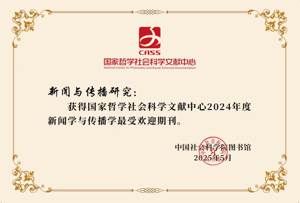在開幕式上,中國社會科學(xué)院圖書館發(fā)布《國家哲學(xué)社會科學(xué)文獻(xiàn)中心最受歡迎期刊報告(2024年度)》,《新聞與傳播研究》榮獲“國家哲學(xué)社會科學(xué)文獻(xiàn)中心2024年度新聞學(xué)與傳播學(xué)最受歡迎期刊”。根據(jù)閱讀指數(shù)、下載指數(shù)與受歡迎指數(shù)進(jìn)行統(tǒng)計計算,《新聞與傳播研究》在38種新聞學(xué)與傳播學(xué)期刊中位于前10%,名列最受歡迎期刊排行榜第1位?!缎侣勁c傳播研究》已連續(xù)多年獲得這一榮譽,此次再次榮獲“新聞學(xué)與傳播學(xué)最受歡迎期刊”稱號,說明本刊得到了學(xué)界的高度評價與讀者的高度認(rèn)可。