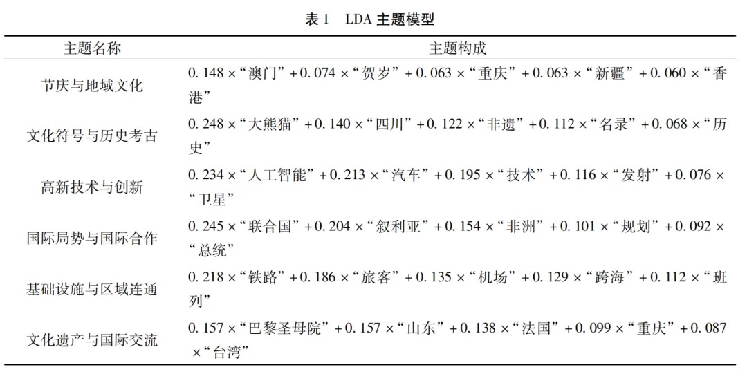 從LDA主題建模結(jié)果來(lái)看,許多國(guó)際傳播的內(nèi)容仍然以傳統(tǒng)文化為核心。例如,“節(jié)慶與地域文化”主題側(cè)重于展現(xiàn)節(jié)慶活動(dòng)和地方特色,而“文化符號(hào)與歷史考古”則關(guān)注如大熊貓、非遺等文化符號(hào)。盡管這些內(nèi)容能夠凸顯中國(guó)的文化底蘊(yùn),卻在一定程度上局限于歷史與文化遺產(chǎn)的單一維度。另外,“高新技術(shù)與創(chuàng)新”以及“國(guó)際局勢(shì)與國(guó)際合作”等主題雖然涵蓋了當(dāng)代議題,但在內(nèi)容呈現(xiàn)上往往以宏大敘事為主。例如,報(bào)道中國(guó)科技發(fā)展時(shí)多強(qiáng)調(diào)“中國(guó)制造”或“中國(guó)科技領(lǐng)先”,但缺少如何改變普通人生活的具象化表達(dá),難以激發(fā)國(guó)際受眾的情感共鳴。同樣,關(guān)于“一帶一路”的經(jīng)濟(jì)報(bào)道多強(qiáng)調(diào)國(guó)家層面的合作和基礎(chǔ)設(shè)施建設(shè),而缺乏對(duì)個(gè)人層面的故事或跨文化交流的具體闡述。