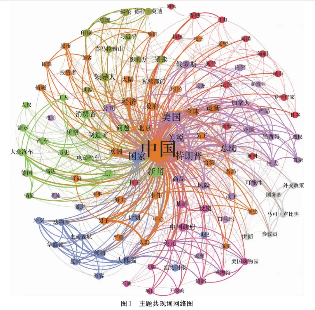 結(jié)合對(duì)海外社交媒體對(duì)中國(guó)報(bào)道的主題共現(xiàn)詞網(wǎng)絡(luò)分析,可以進(jìn)一步驗(yàn)證這一現(xiàn)狀。筆者選取了具有較大國(guó)際影響力的TheNewYorkTimes(《紐約時(shí)報(bào)》),爬取了其在X平臺(tái)上的推文為分析對(duì)象,以“China”(不區(qū)分大小寫(xiě))作為檢索關(guān)鍵詞,爬取了2023年1月1日—2024年12月30日的相關(guān)推文數(shù)據(jù)。經(jīng)過(guò)初步篩選,共獲得101篇包含有效文本的推文。為了確保數(shù)據(jù)分析的準(zhǔn)確性和語(yǔ)義的清晰性,筆者對(duì)文本數(shù)據(jù)進(jìn)一步處理,去除了代詞、副詞等無(wú)效詞匯,并將清洗后的數(shù)據(jù)導(dǎo)入Gephi軟件進(jìn)行主題共現(xiàn)詞網(wǎng)絡(luò)分析。經(jīng)計(jì)算,文本中共提取出有效詞匯725個(gè),基于前167個(gè)高頻詞構(gòu)建的語(yǔ)義網(wǎng)絡(luò)如圖1所示。