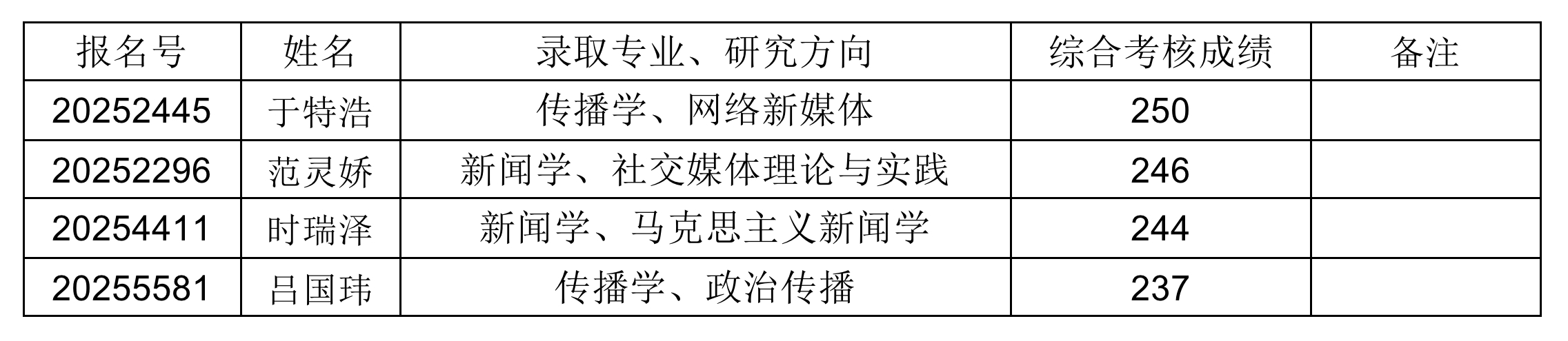 2025年4月22日學校招生工作領導小組召開會議,根據(jù)學校招生實際情況,給新聞傳播學院增加博士招生計劃4人。經(jīng)新聞傳播學院研究生招生工作領導小組討論,按照學院 2025年申請考核招考博士研究生綜合考核成績排序,推薦待錄取增補名單,現(xiàn)予以公示,公示結束后報學校研究生招生工作領導小組審核批準。